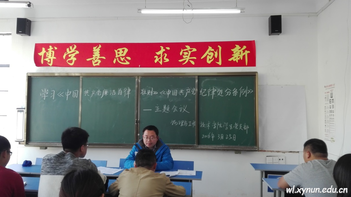 2016年3月25日下午四点半时,物理与工程技术学院学生党支部组织本学院的学生党员、预备党员和积极分子在1201教室对《中国共产党廉洁自律准则》及《中国共产党纪律处分条例》进行了学习。通过对《中国共产党廉洁自律准则》及《中国共产党纪律处分条例》的学习,有效的提高了本支部党员及积极分子的思想觉悟和廉洁自律意识,同时为毕业班学生党员在走向工作岗位之前进行了一次很好的党性教育。