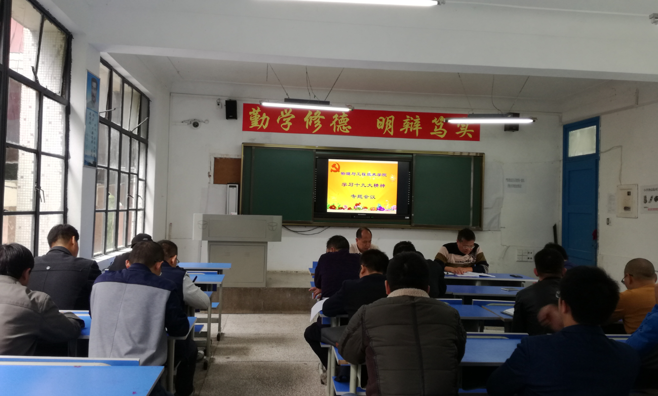 我院教师支部于2017年10月20日下午在1205教室召开了“支部主题党日”活动。首先,总支书记岑家靠同志带领教职工学习十九大精神,他从中国共产党人的初心和使命、我国社会主要矛盾、新时代中国共产党的历史使命、新时代中国特色社会主义思想、新时代坚持和发展中国特色社会主义的基本方略等多个方面进行了讲解,使教职工们更深、更透地领会大会的主题。其次支部书记毛自娟同志带领大家学习了贵州日报评论员文章《撸起袖子 实干兴省》,希望大家将十九大会议精神和实干兴省、实干兴校联系起来,从本职做起,发挥先锋模范带头作用。最后支部书记传达了《关于转发州委组织<关于转发<关于进一步健全完善党支部主题党日制度的工作提示>的通知>的通知》、《关于转发<关于推动建立健全“三个清单”的工作提示>的通知》、《关于转发<省委教育工委转发中共教育部党组关于加强新形势下高校教师党支部建设的意见的通知>的通知》等文件精神。