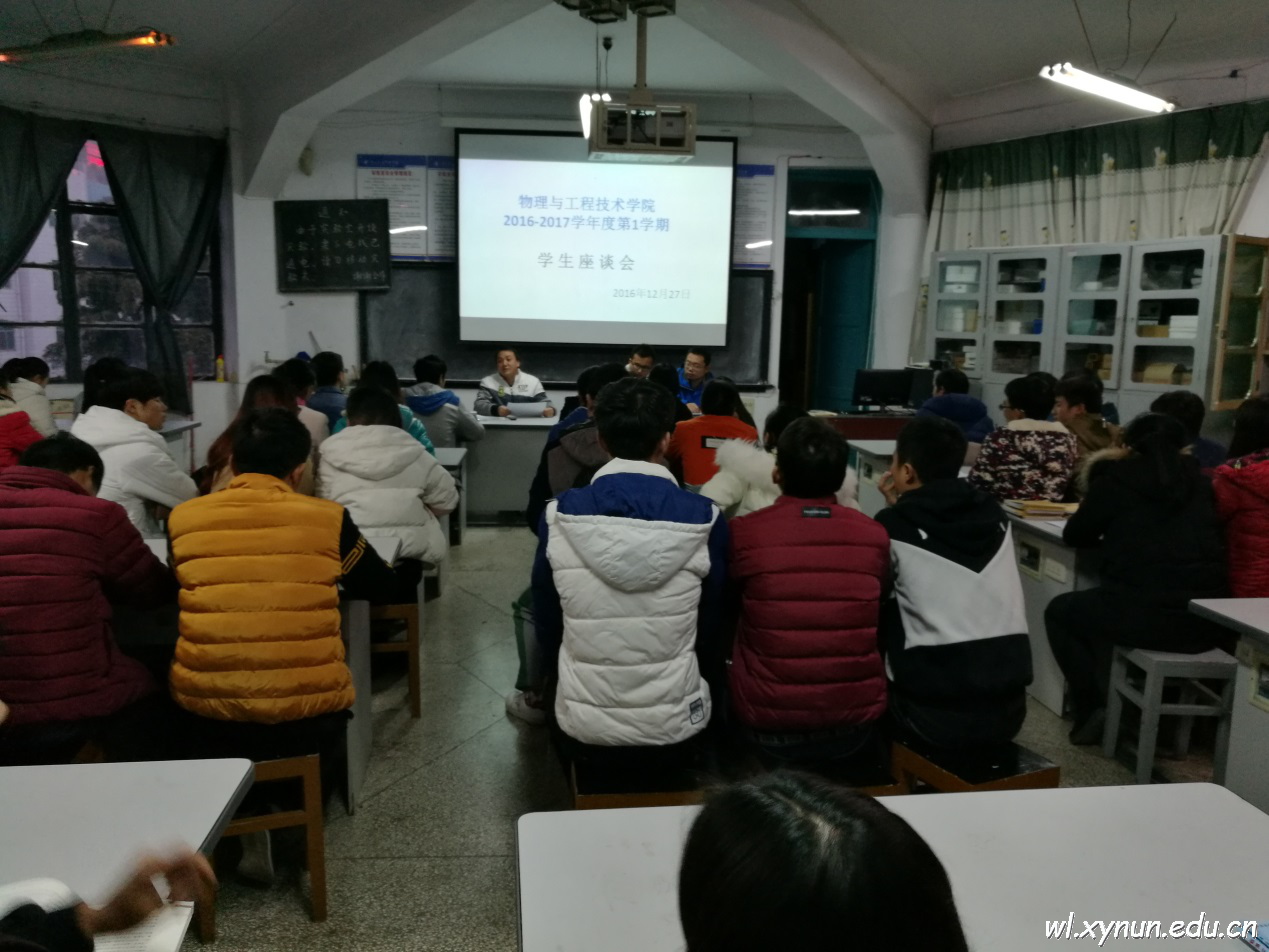 2016年12月27日物理与工程技术学院召开了2016—2017学年度第一学期学生座谈会,由物理与工程技术学院教务科许江勇、王文龙、任建军主持,参会有2014级、2015级、2016级全体教学信息员及每个班的学生代表。通过本次会议系统的了解了各个班级同学对本学期各科任课教师的满意程度,教师上课中存在的问题及学生科、教务科和班主任在管理方面存在问题,为今后的教学及班级管理工作提供了基础资料。