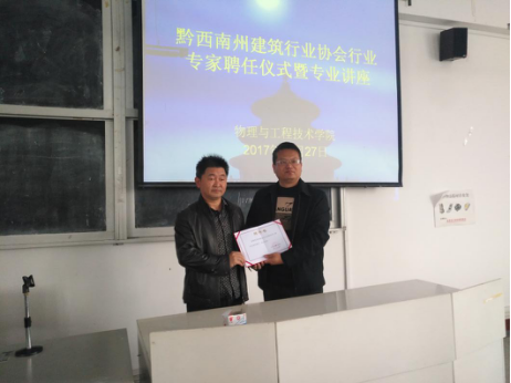 10月27日下午黔西南州建筑行业协会会长王安国、秘书长李爽、西南建筑工程有限公司总工程师祁俊平和办公室主任王婕,受邀到我院就安全工程专业学科建设进行交流指导,李川院长、岑家靠书记、安全工程教研室主任王维建以及安全工程教研室的柳光磊老师和舒仕海老师出席了交流会。会上李川院长向王安国、李爽和祁俊平三位专家颁发专业建设顾问聘用证书。随后祁俊平高级工程师结合自己30多年的建筑行业实践经验,给我院师生作了精彩的专业讲座。