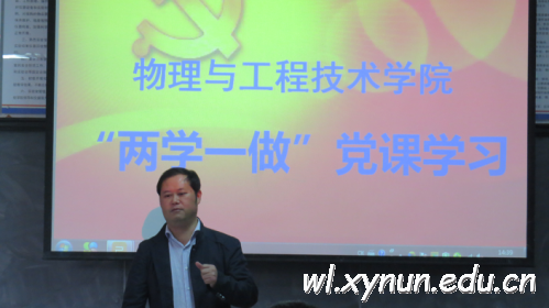 我院党总支组织全院师生党员,于2016年10月19日下午2:30在1403教室开展“两学一做”专题党课学习。学校党委委员副校长彭光明教授向全院师生党员作了“认真开展‘两学一做’学习教育活动,争做合格共产党员”的讲座。彭校长讲解了开展“两学一做”学习教育活动的意义,强调了共产党员要结合“两学一做”学习教育活动,树立大局意识,认真贯彻中央、省及州的方针、政策,时刻与党中央保持一致,与学校党委步调一致,努力将学校、学院建设地更好;对物理与工程技术学院的全体党员提出了学习要求,党员要把理论学习落实到实际中来,大胆创新教学方法、内容和体系,结合学校、学院的发展,以板报、网络、QQ等多种形式大力宣传“两学一做”学习教育活动,调动党员积极性,在工作、学习、生活中起模范带头作用,努力树立标杆。随后,党总支书记王文宝同志向全院师生党员作了 “培育社会主义核心价值观,铸牢兴国之魂”的讲座。王书记讲解了中华民族复兴的战略要务。100多年来,中华民族在一次次探索与失败的磨砺中逐步重构起了自己新的精神价值体系,要在复杂多变的国际环境中站稳脚跟,要在日新月异的国内发展中凝神聚气,要在新的建设征程中蹄急而步稳,必须高扬精神上的先进旗帜,奏响思想文化上的主旋律,建设好我们自己的核心价值观。