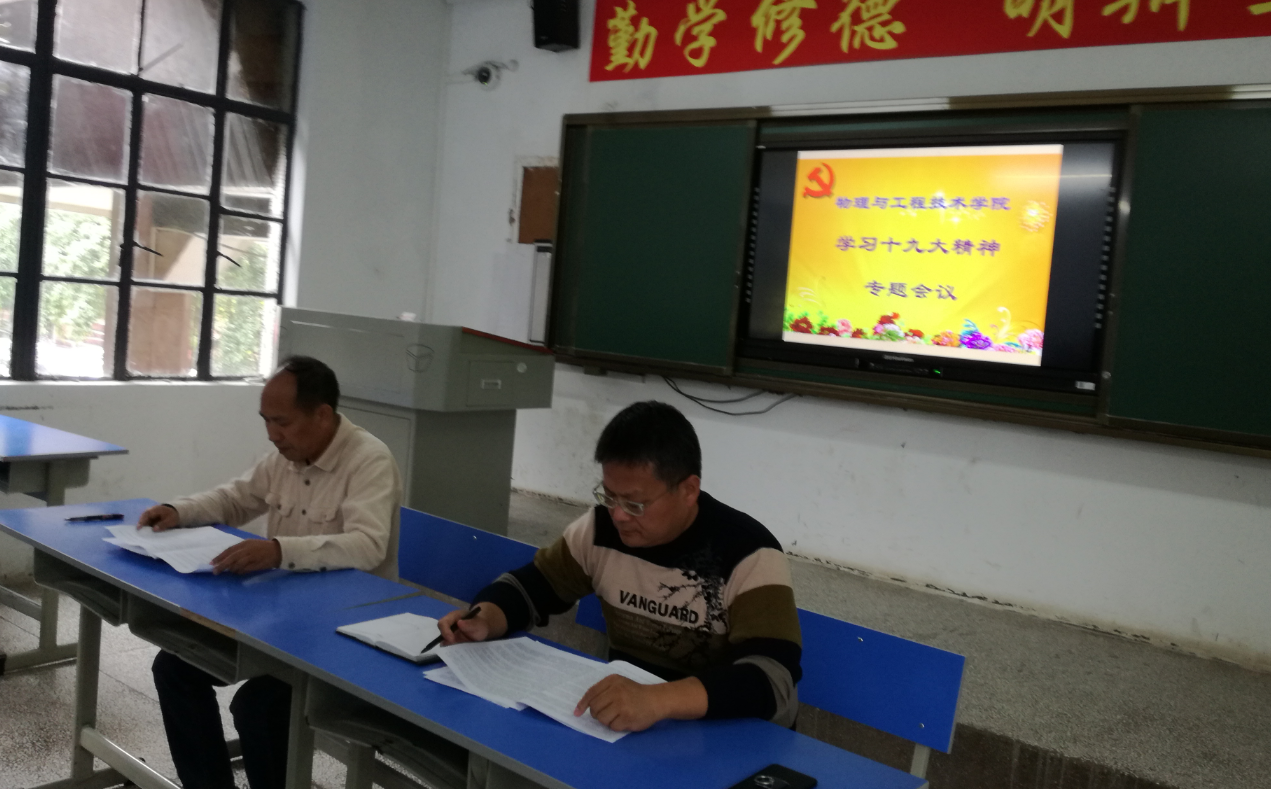 我院教师支部于2017年10月20日下午在1205教室召开了“支部主题党日”活动。首先,总支书记岑家靠同志带领教职工学习十九大精神,他从中国共产党人的初心和使命、我国社会主要矛盾、新时代中国共产党的历史使命、新时代中国特色社会主义思想、新时代坚持和发展中国特色社会主义的基本方略等多个方面进行了讲解,使教职工们更深、更透地领会大会的主题。其次支部书记毛自娟同志带领大家学习了贵州日报评论员文章《撸起袖子 实干兴省》,希望大家将十九大会议精神和实干兴省、实干兴校联系起来,从本职做起,发挥先锋模范带头作用。最后支部书记传达了《关于转发州委组织<关于转发<关于进一步健全完善党支部主题党日制度的工作提示>的通知>的通知》、《关于转发<关于推动建立健全“三个清单”的工作提示>的通知》、《关于转发<省委教育工委转发中共教育部党组关于加强新形势下高校教师党支部建设的意见的通知>的通知》等文件精神。