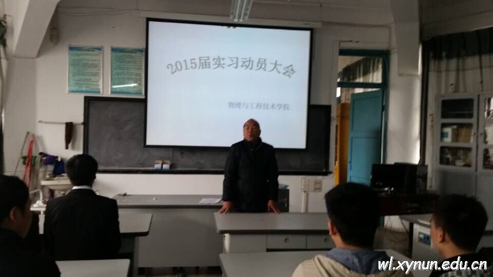 为增强毕业生的实习意识,提高毕业生的就业质量,切实做好2011级本科毕业生的实习工作,物理与工程技术学院于3月6日下午4:30在1403教室隆重举行了实习动员大会。学院党总支书记王文宝书记出席会议,会议由周丽萍老师主持,参加会议的有实习指导教师及2011级物理本科班的全体学生。