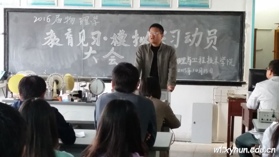 根据物理与工程技术学院物理学专业人才培养方案和教学计划的安排,2016届物理学专业学生即将开展教师技能训练,包括:教育见习、模拟实习、教育实习三方面的内容。为做好我院2016届物理学教育见习和模拟实习工作,于2015年10月15日上午10点,我院在1403教室召开2016届师范生教育见习·模拟实习动员大会,对即将进行教育实习和模拟实习的师范生进行动员,同时并宣布相关工作计划和工作安排。 出席此次动员大会的领导和老师有我院李川院长,教务科副科长许江勇老师,物理教研室主任张娟利老师,本次参与指导的教师:方 明、周丽萍、周 波、苏立波、张维鸣、周万福、王传坤等老师。
