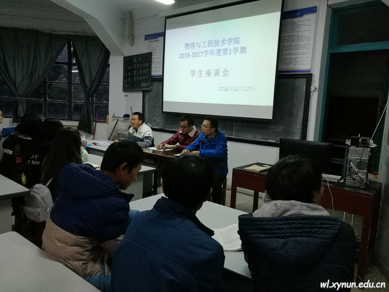 2016年12月27日物理与工程技术学院召开了2016—2017学年度第一学期学生座谈会,由物理与工程技术学院教务科许江勇、王文龙、任建军主持,参会有2014级、2015级、2016级全体教学信息员及每个班的学生代表。通过本次会议系统的了解了各个班级同学对本学期各科任课教师的满意程度,教师上课中存在的问题及学生科、教务科和班主任在管理方面存在问题,为今后的教学及班级管理工作提供了基础资料。