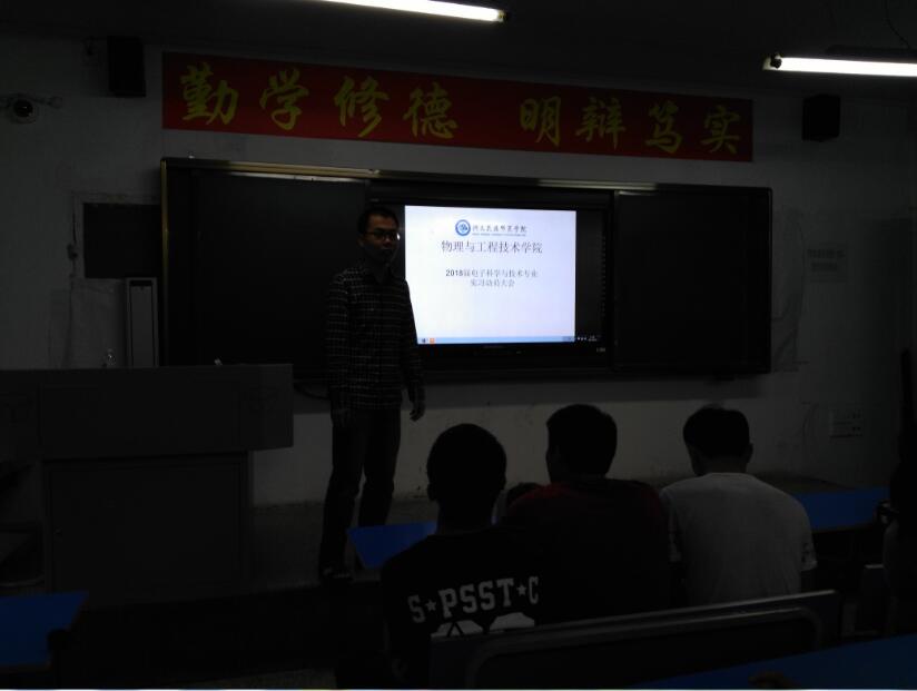 6月30日下午,电子科学与技术专业2018届毕业实习动员大会在1205教室召开,会议由电子技术教研室主任胡总华老师主持,实习队带队负责老师、班主任以及2014级全体同学参加了大会。