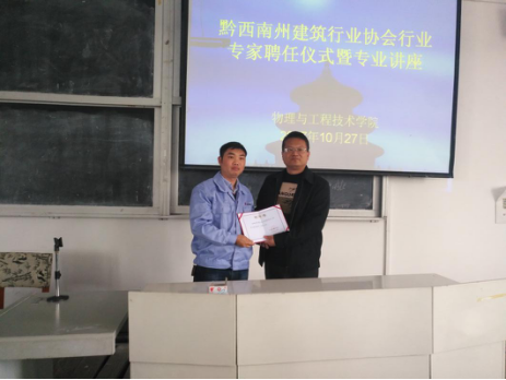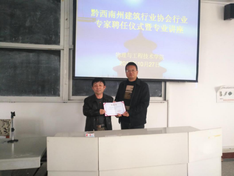 10月27日下午黔西南州建筑行业协会会长王安国、秘书长李爽、西南建筑工程有限公司总工程师祁俊平和办公室主任王婕,受邀到我院就安全工程专业学科建设进行交流指导,李川院长、岑家靠书记、安全工程教研室主任王维建以及安全工程教研室的柳光磊老师和舒仕海老师出席了交流会。会上李川院长向王安国、李爽和祁俊平三位专家颁发专业建设顾问聘用证书。随后祁俊平高级工程师结合自己30多年的建筑行业实践经验,给我院师生作了精彩的专业讲座。